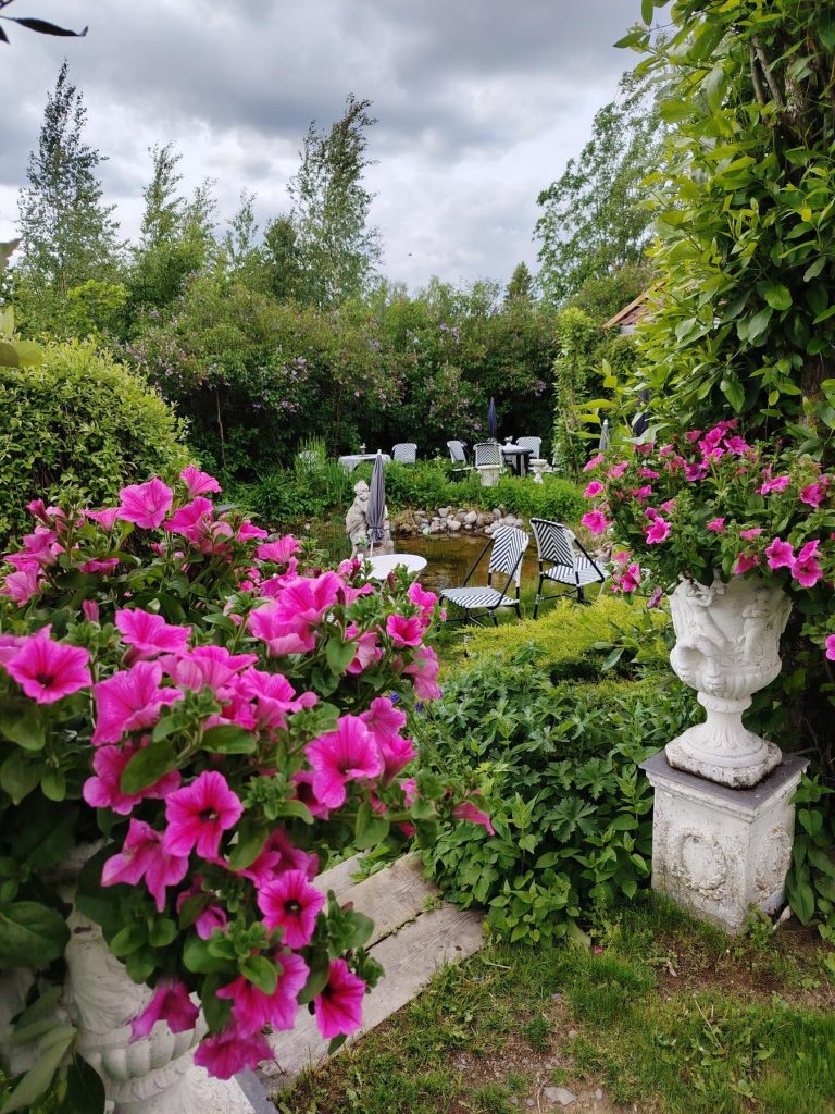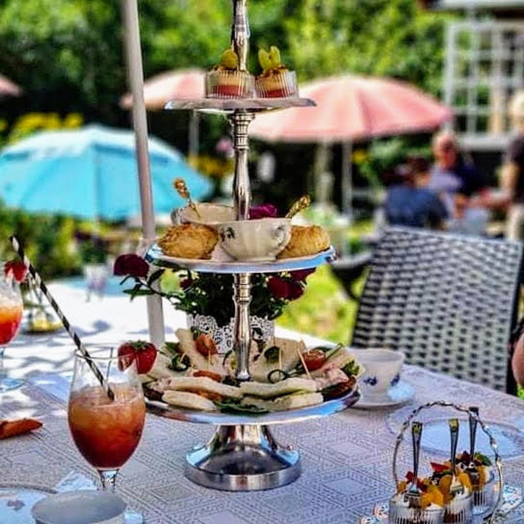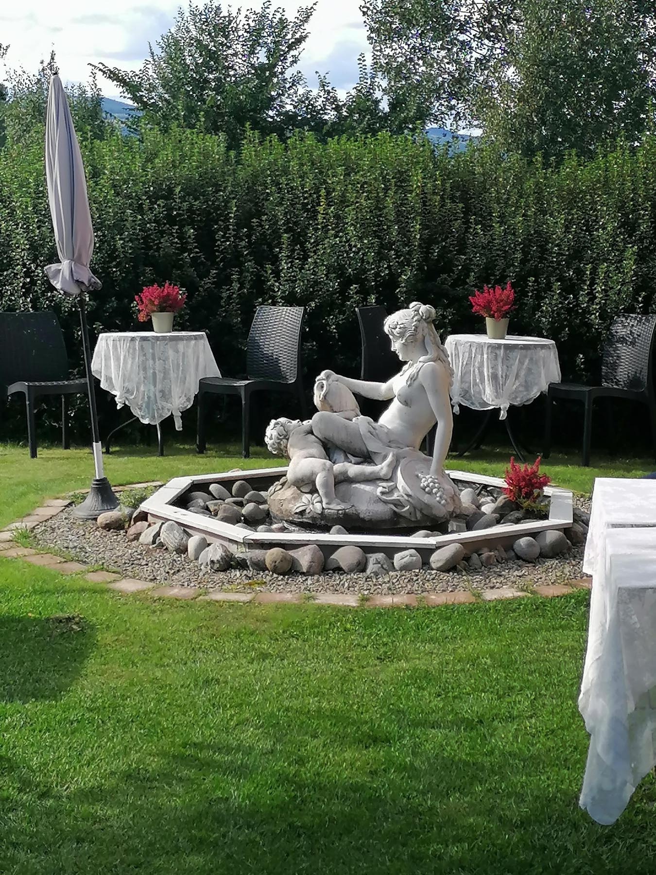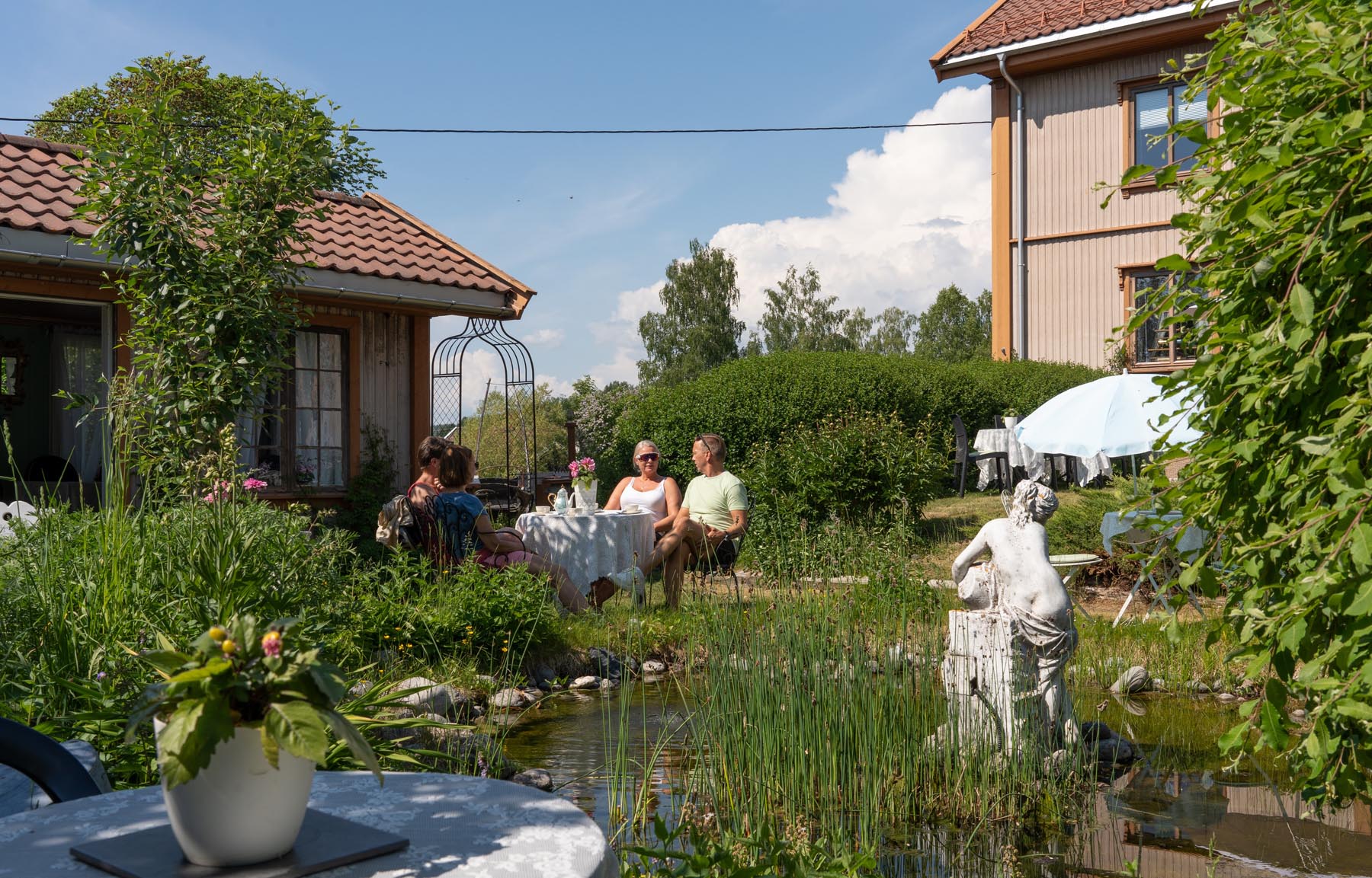 Uteserveringen vår er en tur verdt i seg selv. I vår grønne oase finner du skulpturer og fontener i skjønn forening. Nyt serveringen i solen rundt hagedammen, eller i skyggen under syrinene.